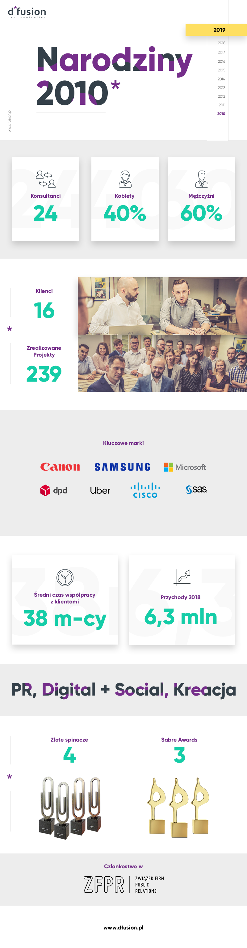 Ale zleciało! 9 lat temu mieliśmy ambitne plany. Chcieliśmy zbudować firmę, która będzie specjalizować się w obsłudze firm z sektora nowych technologii. Małą, „zwinną” agencję, pracującą z szybkością japońskich Shinkansenów, przywiązaną do jakości i obsługi klienta niczym Virgin Richarda Bransona. Gdyby 9 lat temu jakiś wizjoner albo podróżnik w czasie powiedział nam, że w przyszłości naszymi klientami będą takie firmy jak Microsoft, Samsung, Canon, Uber czy Cisco, a nasza agencja będzie zgarniać prestiżowe nagrody na polskiej i międzynarodowej arenie PR, to pewnie zapytalibyśmy go, jaki towar bierze i gdzie można go kupić.