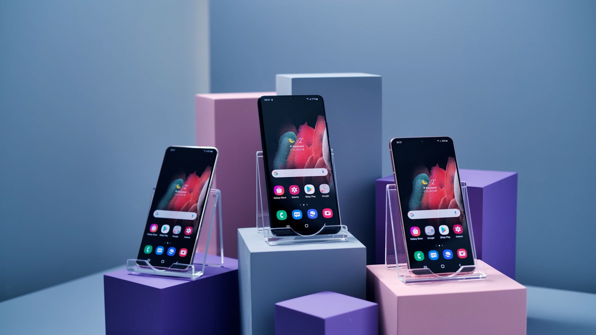 - Use of mono-colour arrangements corresponding to the colours of the Samsung Galaxy S21 product launch